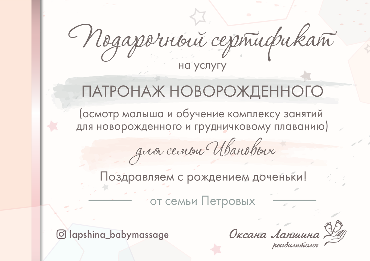 Приобретите именной подарочный сертификат на услугу патронажа новорожденного.